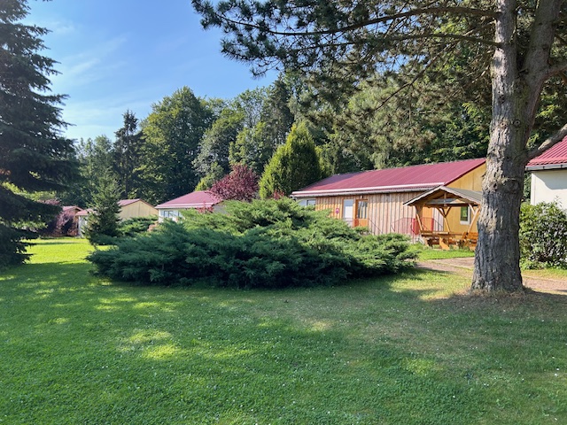 Rechts vom Hauptgebäude, malerisch am Waldrand gelegen, erwarten Sie die gemütliche Ferienhäuser. Dazwischen laden weitläufige Rasenflächen zum Entspannen, Spielen oder Sonnen ein – perfekt für Groß und Klein!