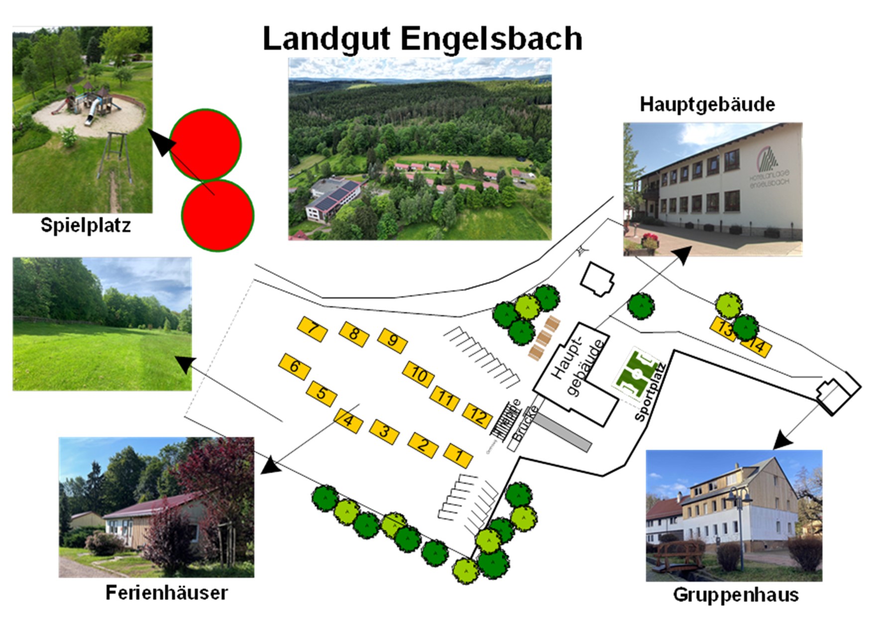 Rechts vom Hauptgebäude, malerisch am Waldrand gelegen, erwarten Sie die gemütliche Ferienhäuser. Dazwischen laden weitläufige Rasenflächen zum Entspannen, Spielen oder Sonnen ein – perfekt für Groß und Klein!